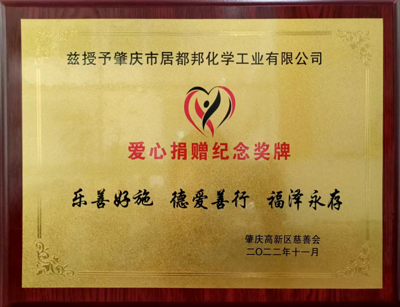 11月16日,“奉獻(xiàn)愛心力量,彰顯企業(yè)擔(dān)當(dāng)”,肇慶市高新區(qū)愛心慈善會,為肇慶市居都邦化學(xué)工業(yè)有限公司授予《愛心捐贈紀(jì)念獎...